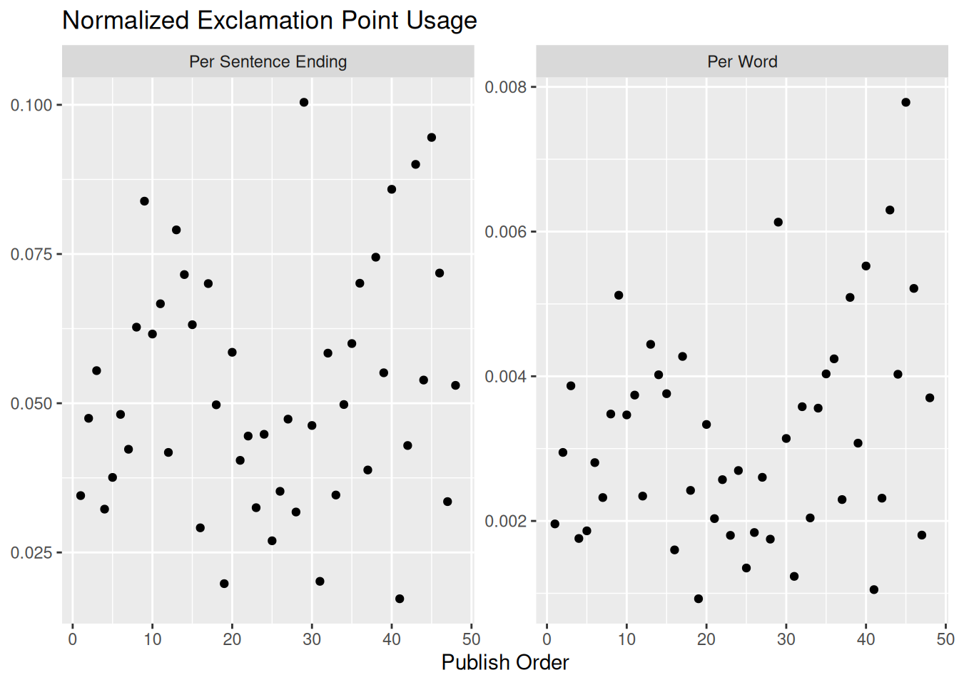 lm(formula = exclamation_points ~ publish_order, data = filter(exclamation_points_summary,